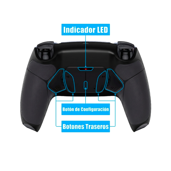 • 4 Botones Remapeables: Puedes activar el programa de reasignación durante el juego y asignar un máximo de 15 botones (X, O, Triángulo, Cuadrado, Arriba, Abajo, Izquierda, Derecha, L1, L2, R1, R2, L3, R3, touchpad) a los botones traseros.